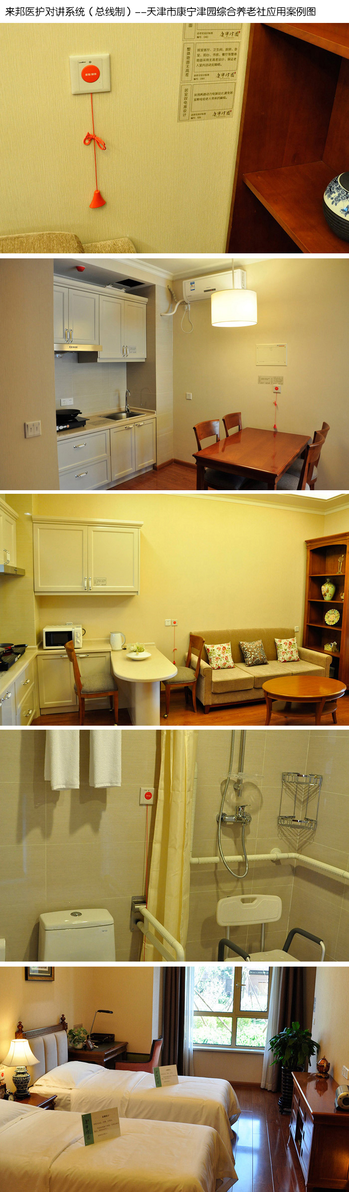 项目设计:首批开放的690套老年公寓,每套公寓的卧室、客厅、书房、厨房、卫生间区域各设置1个紧急报警点,分别安装1台呼叫对讲分机或1台防水报警按钮;6个服务台,分别安装1台可视对讲管理主机;以及用于系统中的其它相关设备。