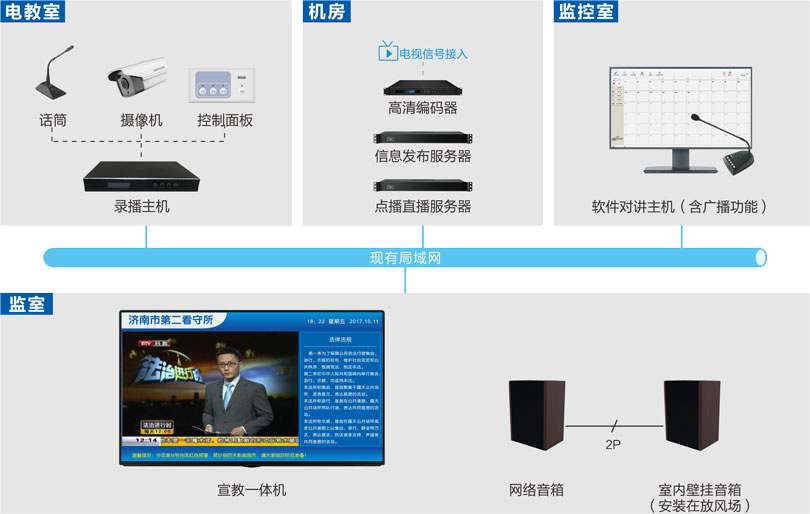 金年会电化教育系统 主要由视频宣教和广播两部分组成,主要应用于监管场所对在押人员进行统一视频宣传教育与音频广播,集成了信息播报、大课教育、视频点播直播和录播、文件视频播放等模块功能。